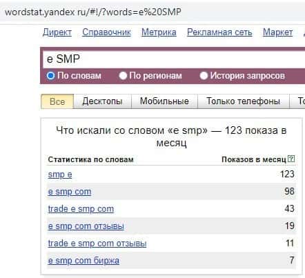 Второй запрос в Яндекс на английском языке "e SMP" выдает уже результат в 123 показа в месяц. Это существенно больше, чем в предыдущем случае.