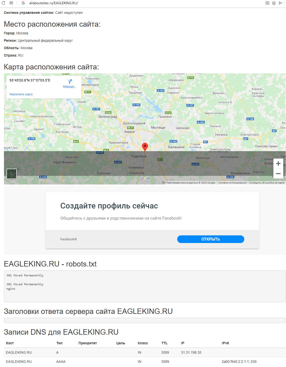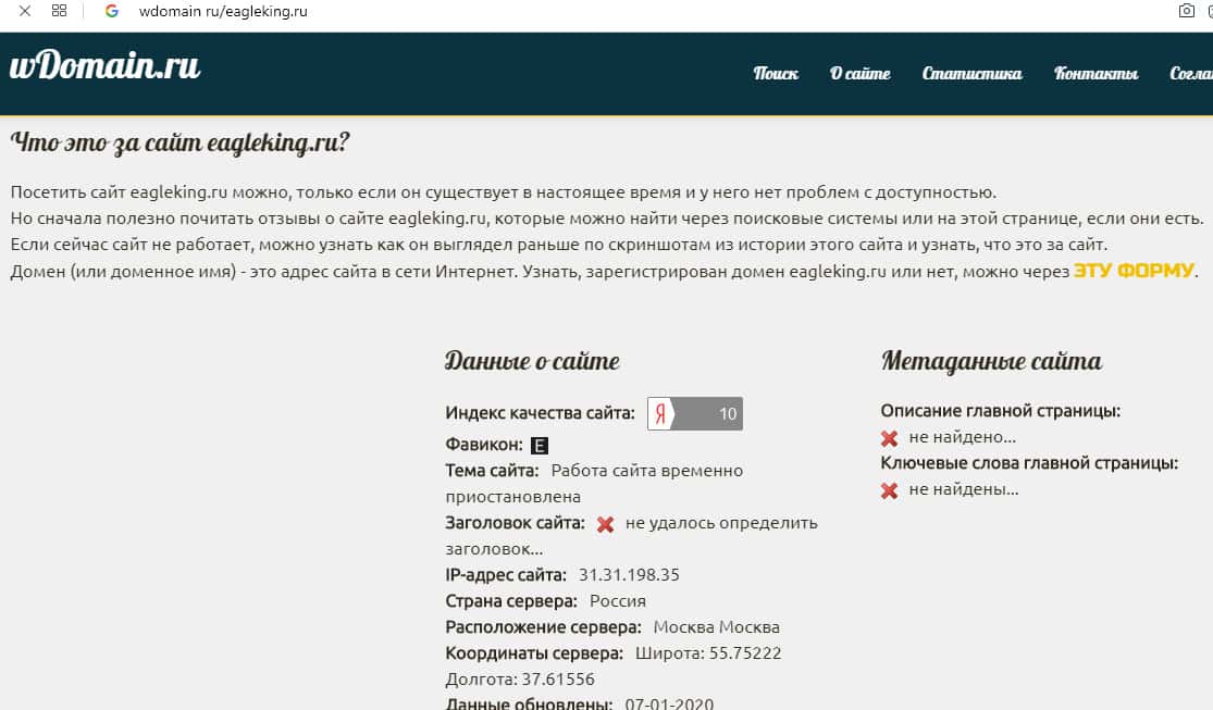 Судя по сведениям, которые предоставил уважаемый интернет-сервис allaboutsites ru, возраст домена веб-портала надувательской форекс конторы не определен, известно лишь месторасположение - Центральный федеральный округ Москвы. Также сведений о веб-странице слившегося злодейского форекс брокера EAGleking на просторах интернета не осталось.