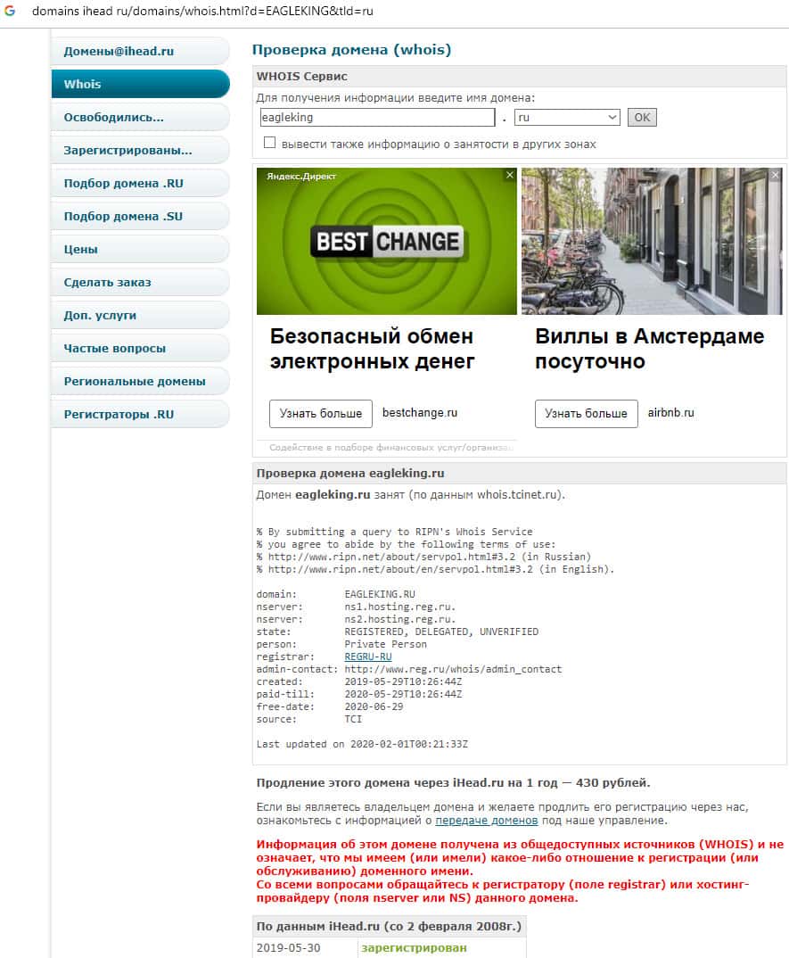 Судя по информации, которая содержится на известном интернет-сайте domains ihead ru, срок регистрации домена веб-площадки аферной форекс компании ЕА Глекинг истек. Для того, чтобы продлить действие, владелец шулерского дилера должен оплатить. В итоге, это подтверждает, что руководство EAGleking быстренько по-тихому смылось в офшор.