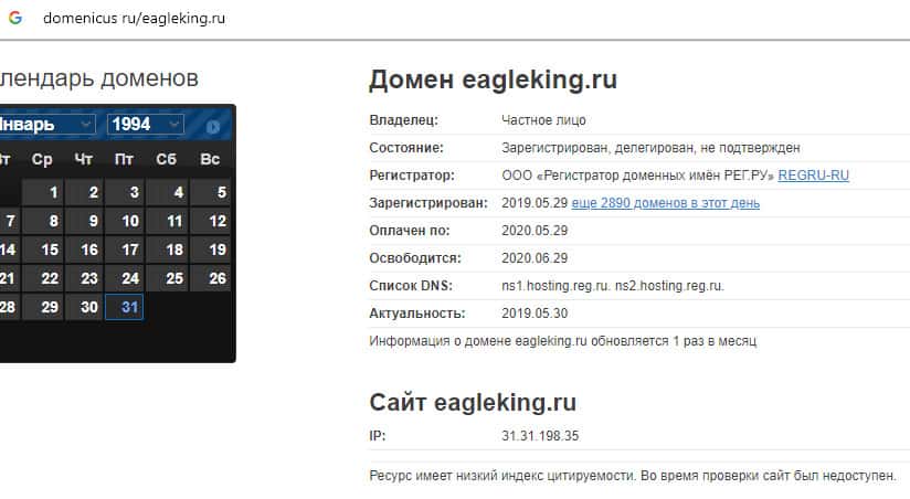 На известной веб-площадке domenicus ru прямо указывается, что на данный период времени (во время проверки) интернет-портал махинаторского биржевого брокера EAGleking недоступен. На лицо доказательство того, что слившийся брокер ЕА Глекинг сумел замести за собой все следы, что невозможно их выследить и подкопаться к чему-либо.