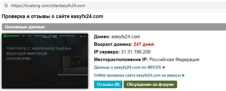 На информационном сайте trustorg com была произведена проверка ip-адреса скам-организации Изи ФХ 24. Выяснилось, что сайт данной конторы числится на территории Российской Федерации. Из этого следует вывод о том, что вкладывать свои денежные средства на сайте сомнительной компании EasyFX24 не имеет смысла !!!