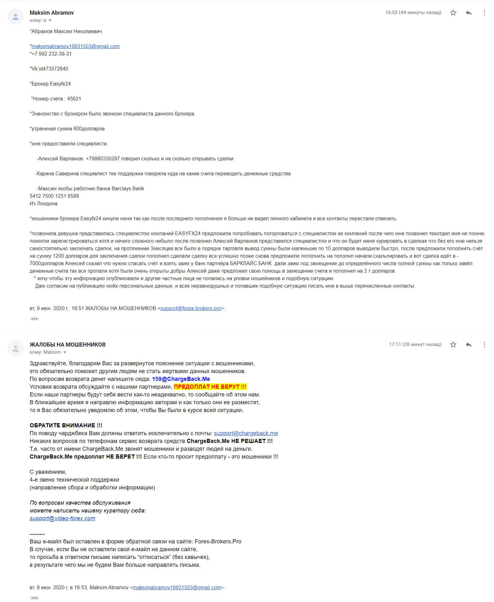 Сменить Ваш пароль очень легко, имея доступ к Вашей электронной почте. Аферисты EasyFX24 собирают все имеющиеся данные о клиенте аргументируя это тем, что это якобы необходимо для вывода денежных средств клиента. Шулера могут в любой удобный им момент украсть все Ваши денежные средства !!!
