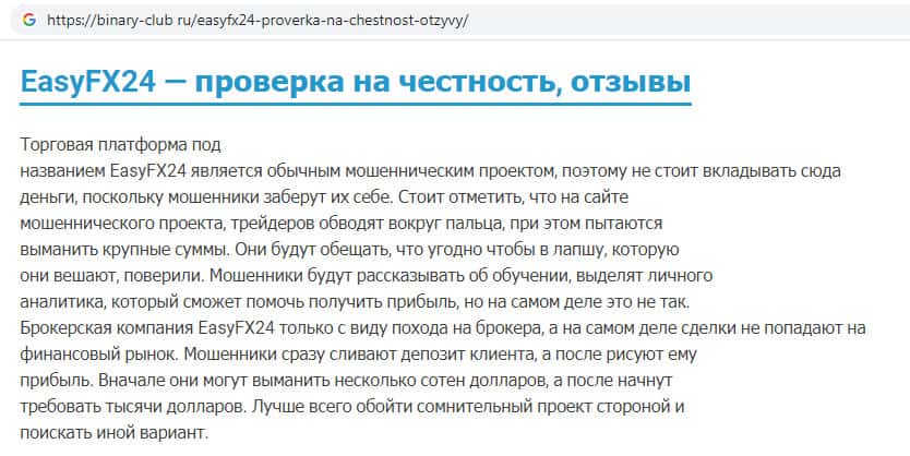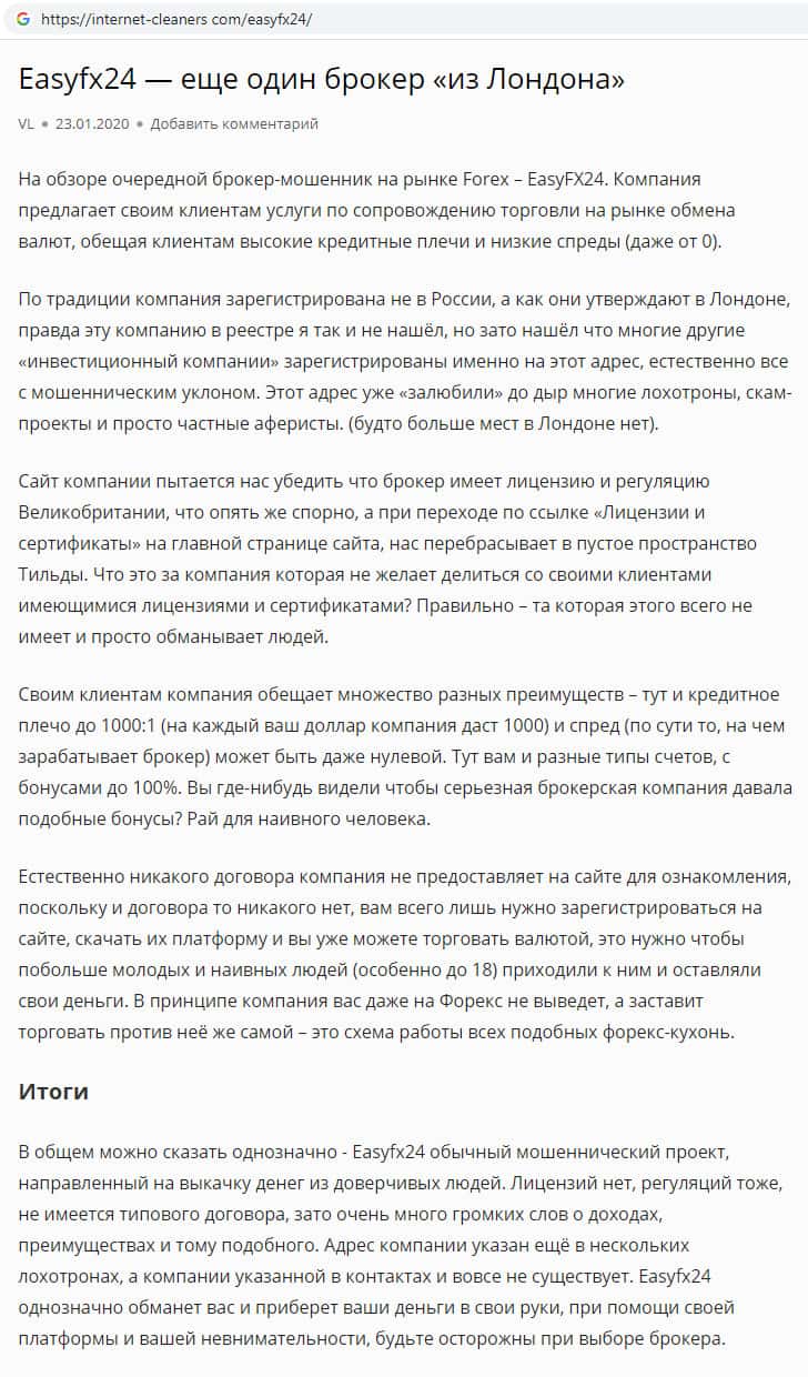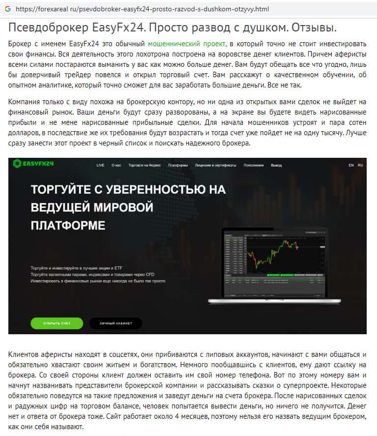 Аферисты EasyFX24 во всемирной паутине распространяют фальшивую информацию о своей компании