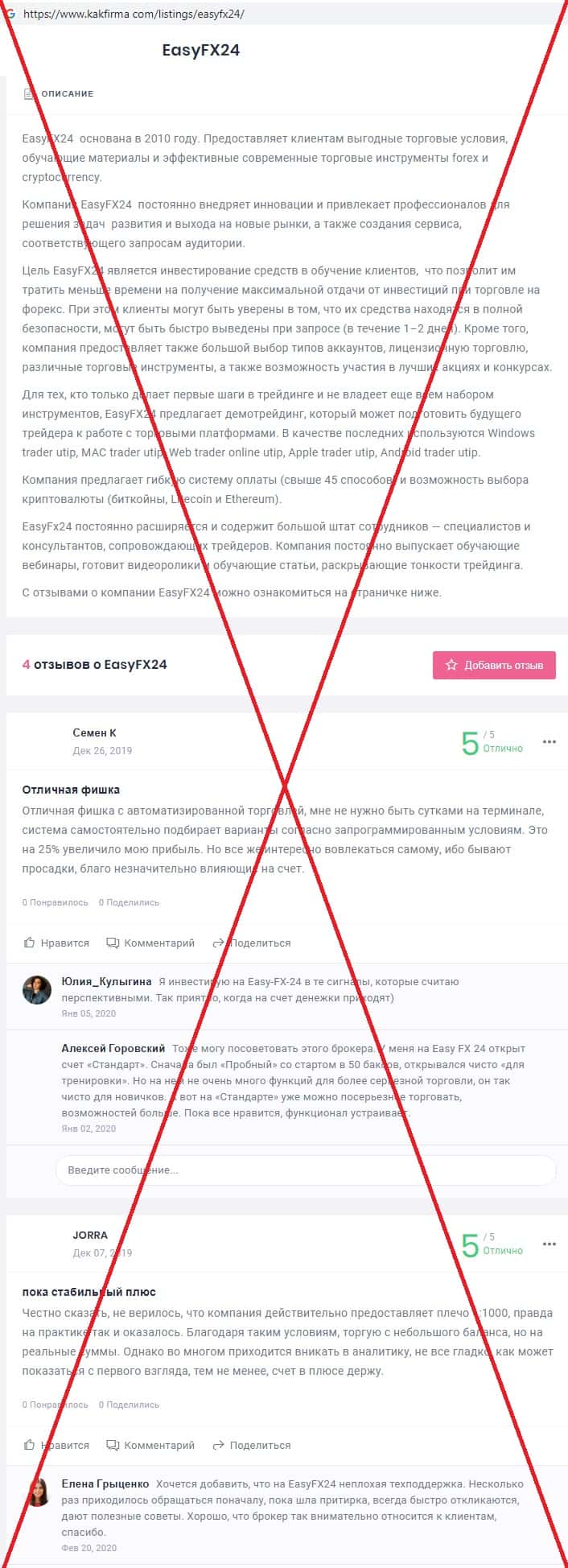kakfirma com - сайт с фальшивыми отзывами о компании EasyFX24