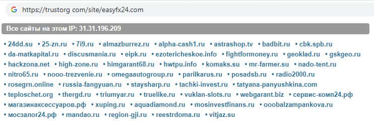 Так же при помощи проверки веб-ресурса компании EasyFX24 на сайте трусторг ком выяснилось, что сайт данной скам-организации находится по соседству с сайтами, которые не имеют никакого отношения к рынку Форекс, а именно с новостными веб-порталами, казино, интернет-магазинами, большинство из которых российские.