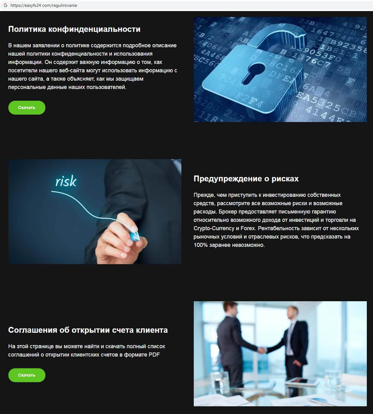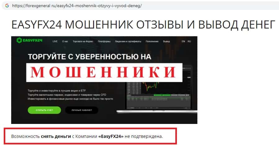 - Информация о всевозможных рисках потери денежных средств на сайте аферистов EasyFX24