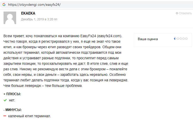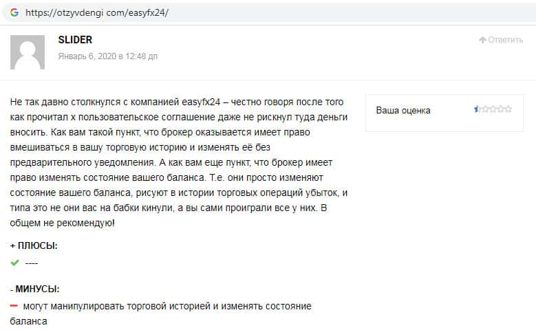 На сайте-отзовике отзывденьги ком замечен отзыв о скам-компании EasyFX24, автор которого пишет, что мошенники используют терминал, который автоматически подстраивается под действия клиента. Имеется ввиду то, что возникают различные ситуации перед самым закрытием позиций, в итоге сливаются все денежные средства.