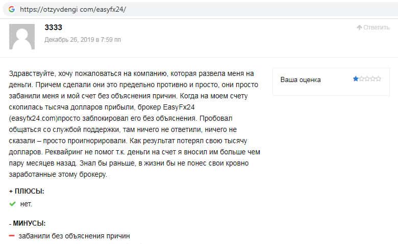 На сайте-отзовике otzyvdengi com замечен отзыв о мошенниках Изи ФХ 24. Автор данного комментария пишет о том, что шулера заблокировали его торговый счет ничего не объясняя, в результате чего клиент потерял тысячу долларов. Учитесь на чужих ошибках и не связывайтесь со скам-брокером EasyFX24 !!!
