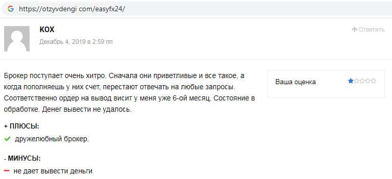 На веб-сервисе otzyvdengi com отыскан отзыв, автор которого пишет о том, что псевдо-брокер Изи ФХ 24 очень хитро облапошивает людей. Сразу же после того, как клиент пополняет торговый счет, аферисты перестают отвечать на какие-либо запросы на вывод денежных средств, создавая видимость будто запрос находится в обработке.