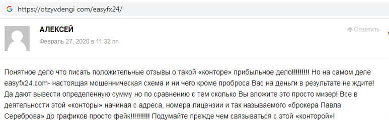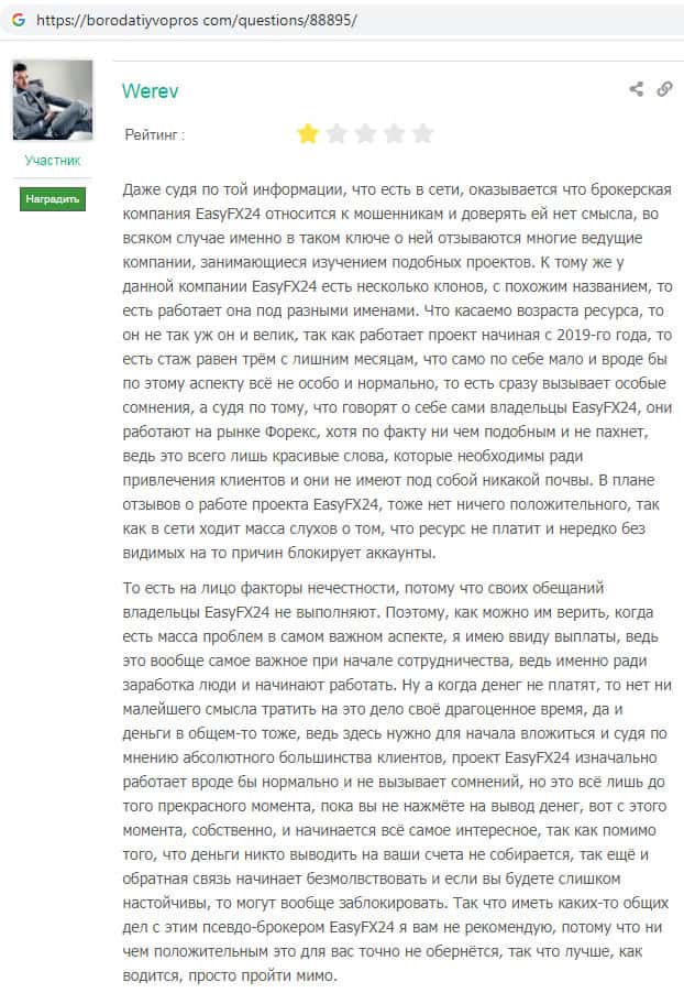 На веб-сайте borodatiyvopros com отыскан отзыв, автор которого утверждает, что на веб-сайте шараги Изи ФХ 24 на самом деле не осуществляются реальные сделки, идет лишь имитация сделок. При этом аферисты EasyFX24 позиционируют себя как брокера с ведущей мировой торговой платформой, кем на самом деле не являются.
