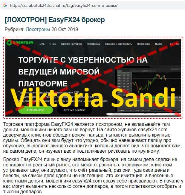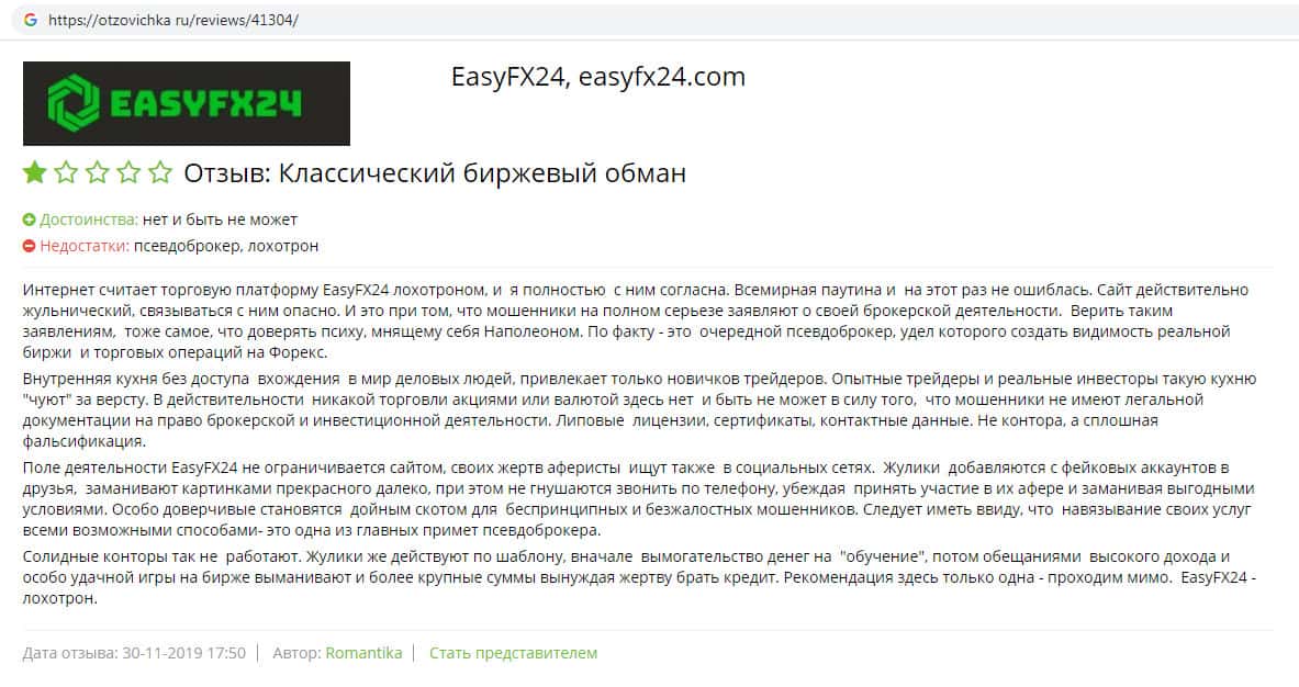 На веб-площадке отзовичка ру отыскан отзыв об обмане со стороны компании Изи ФХ 24. Шулера действуют по шаблону. Вначале мошенники занимаются вымогательством предлагая псевдо-обучение, после чего обещая высокий доход предлагают якобы стать работником их компании. На самом деле таких скам-компаний как EasyFX24 в интернете достаточно.