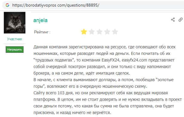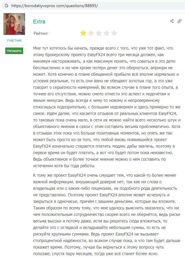 На веб-портале бородатыйвопрос ком обнаружен комментарий о мошенническом проекте EasyFX24. Данная контора работает прекрасно до тех пор, пока зарегистрированный пользователь не делал попытки осуществить вывод денежных средств. Жулики как правило возвращают лишь часть денег, требуя выплатить вымышленную страховку и комиссии.