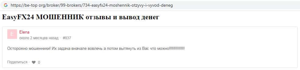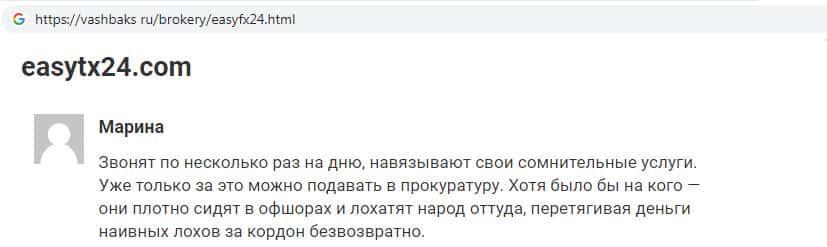 На веб-площадке вашбакс ру замечен отзыв, автор которого некая Марина пишет, что мошенники EasyFX24 стали ей очень часто названивать, навязывая сомнительные услуги своей компании. Найти шулеров крайне сложно, поскольку вся информация о местонахождении конторы на их дырявом сайте - фейк.