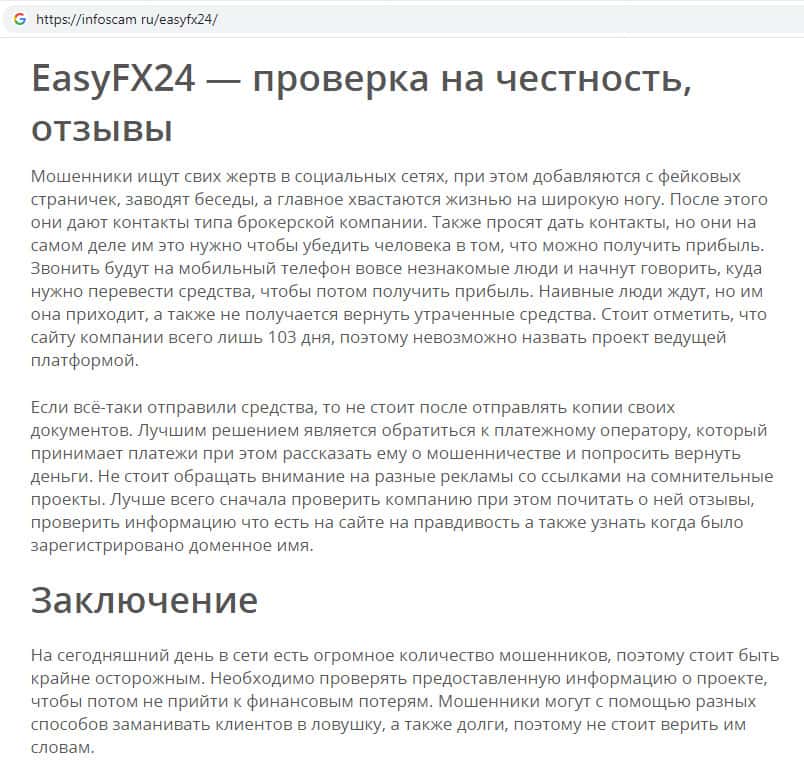 - Аферисты EasyFX24 во всемирной паутине распространяют фальшивую информацию о своей компании