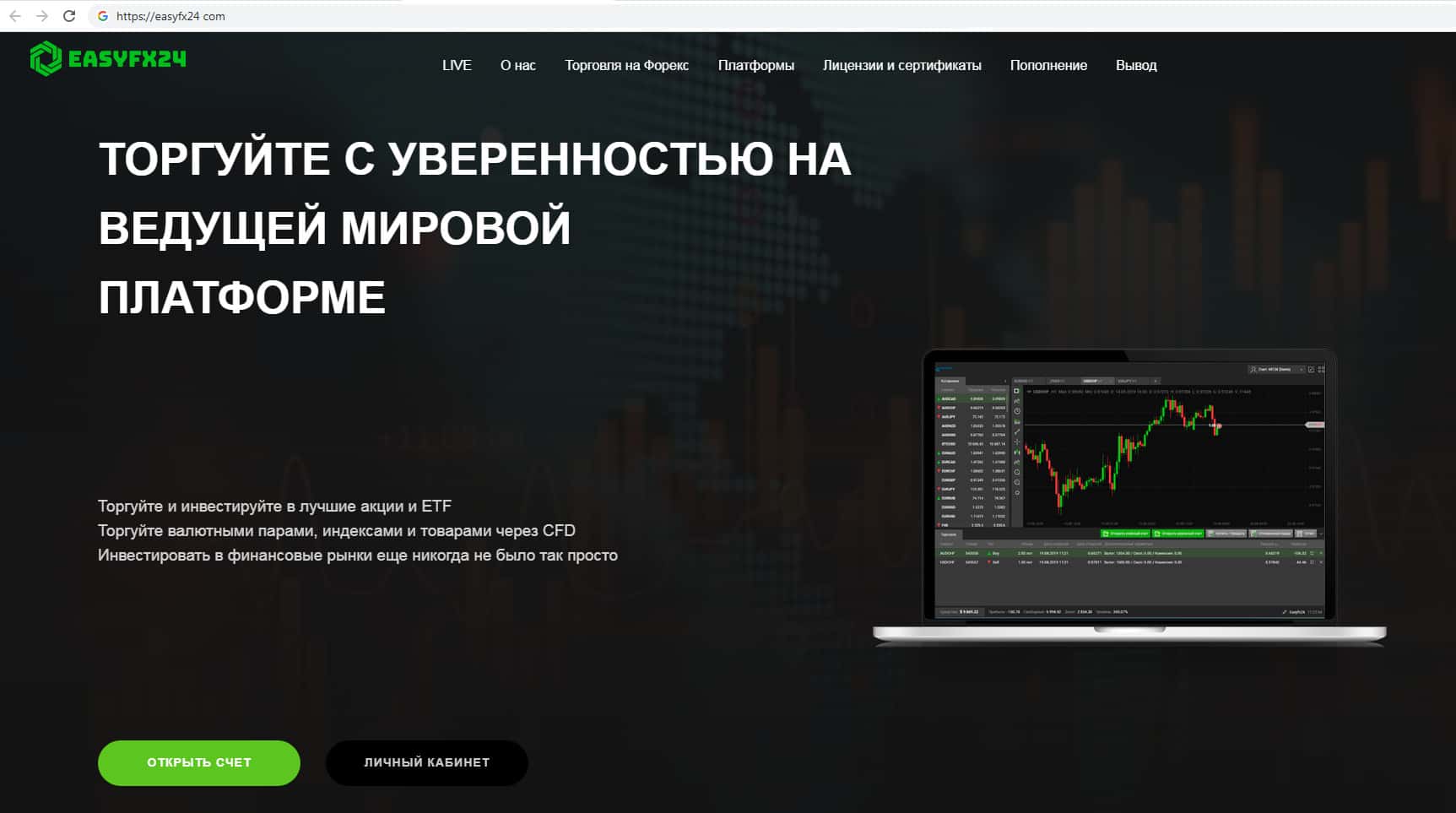 Шулера EasyFX24 дают множество обещаний, которые в итоге не выполняют. Например, обеспечить доступный и надежный доступ к мировым финансовым рынкам, к которым на самом деле никакого отношения не имеет. Увеличить свой капитал при помощи торговли на сайте скам-брокерской конторы Изи ФХ 24 невозможно !!!