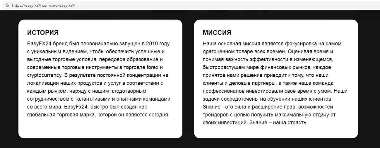 Шулера EasyFX24 нагло врут о миссии своей компании, поскольку их основной задачей является привлечение лохов в свою контору, которые будут платить им зарплату в размере нескольких тысяч долларов и ждать каких-либо выплат. Скам-брокер Изи ФХ 24 специально приукрашивает информацию о своей шараге.