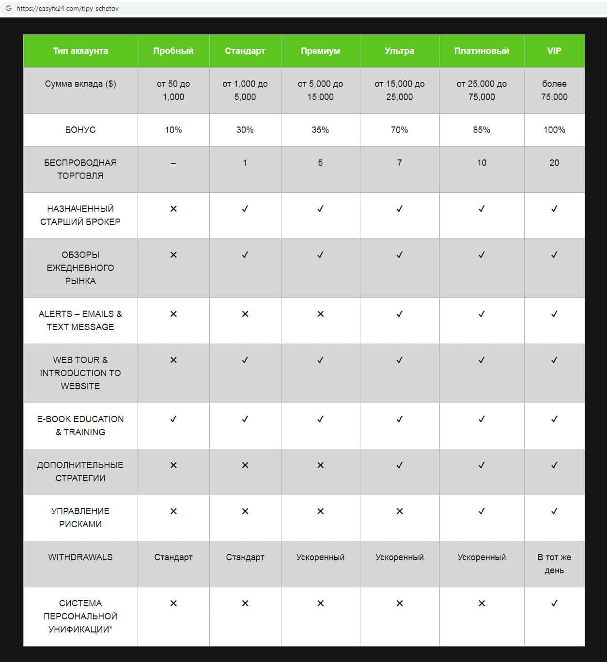 - Типы торговых счетов предлагаемых на сайте мошеннической организации EasyFX24
