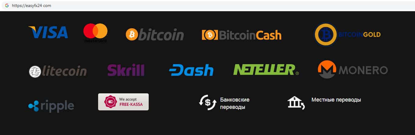 Для перевода денежных средств аферисты EasyFX24 предоставляют на своем официальном сайте множество платежных систем, якобы предоставляя выбор клиенту каким способом можно пополнить торговый счет. Связавшись со скам-брокером Изи ФХ 24 Вы должны понимать, что подобные организации зачастую не возвращают деньги людям.
