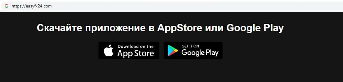 Жулики Изи ФХ 24 на своем фальшивом интернет-ресурсе не предоставляют никакой дополнительной информации о своей торговой платформе. Можно найти только лишь ссылки на приложения с платформой, которую они называют надежной. Ни в коем случае не скачивайте на свой смартфон подобные программы !!!