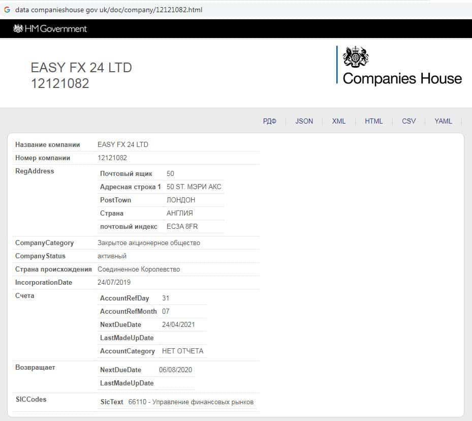 Вместо лицензии аферисты Изи ФХ 24 предлагают пользователю взглянуть на таблицу с данными о конторе, где имеется информация о регистрационном номере. Если проверить, то возможно регистрации у брокерской скам-организации нет, а данный регистрационный номер может оказаться вымышленным.