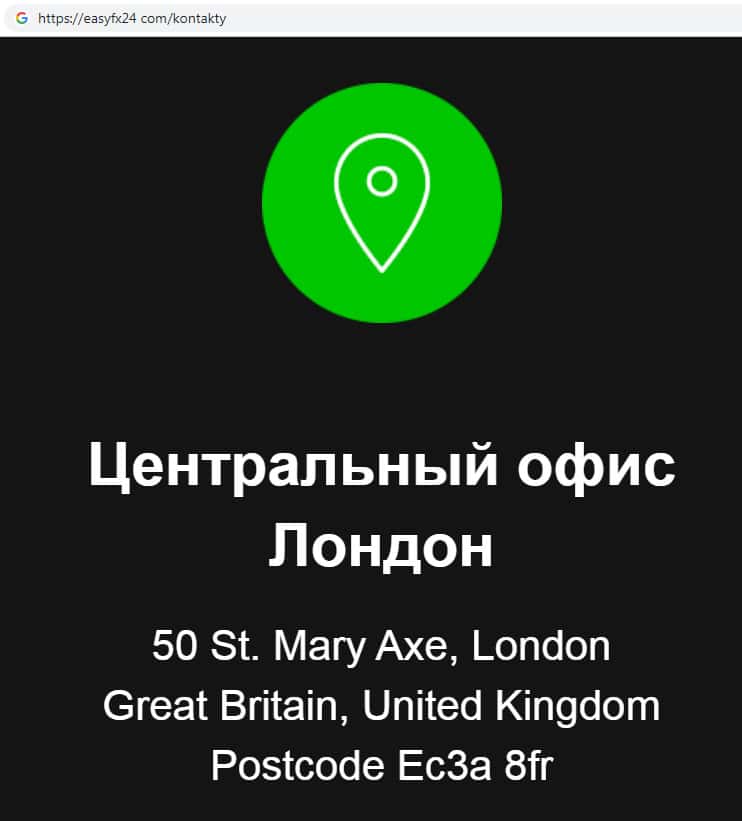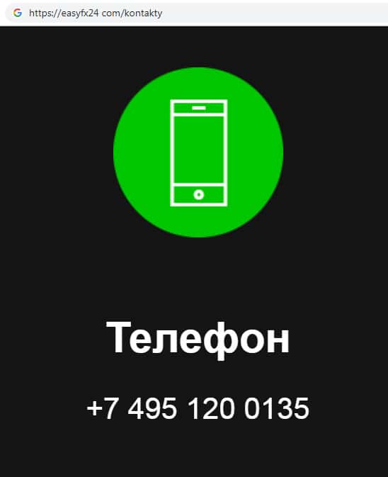 Согласно контактной информации, которую указывает о себе мошенническая организация EasyFX24 зарегистрирована в британской столице, Лондоне. Где ныне базируется огромное количество аналогичных компаний. Просим обратить свое внимание на то, что контактный номер телефона данной конторы свидетельствует о том, что Изи ФХ 24 находится на территории России.