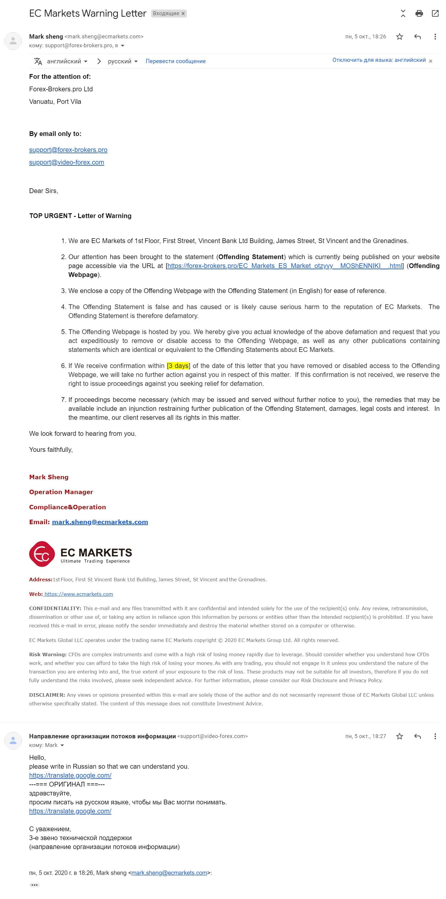 Как обычно и бывает, мошенники из ЕС Маркетс не стали оригинальными, а объявили, что дают 3 дня на удаление данной статьи, вот чувствуется все таки доброта лохотрона к данному ресурсу, такая щедрость - 3 дня дали на уделение статьи, спасибо огромное. Текст жалобы от мошенников приводим ниже.