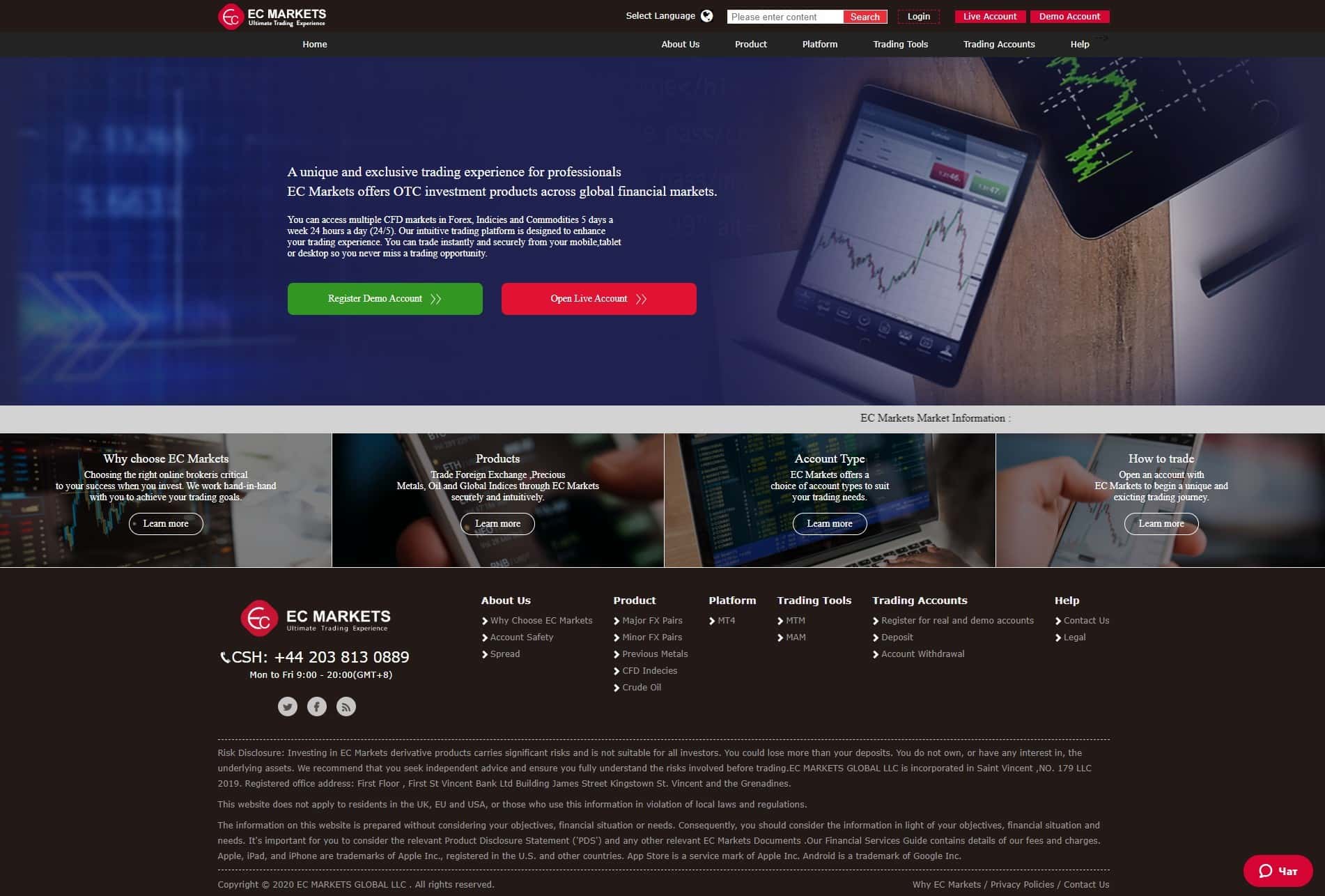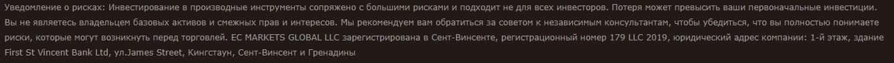Исходя из данных, контора EC Markets, принадлежит некой компании EC MARKETS GLOBAL LLC, которая зарегистрирована на оффшорных островах Сент-Винсент и Гренадины.