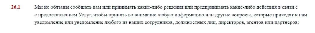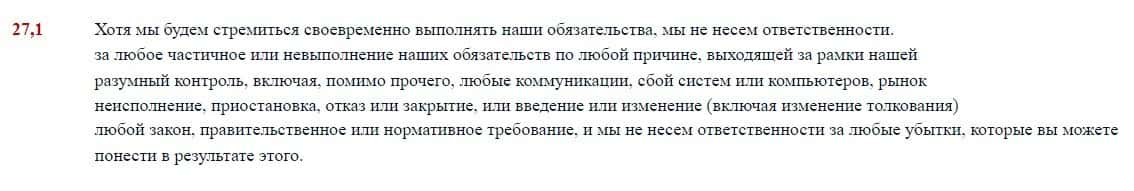 В соглашении также обозначено, что лохотрон EC Markets не несет никакой ответственности за невыполнения пунктов данного соглашения, если возникли форс-мажоры.