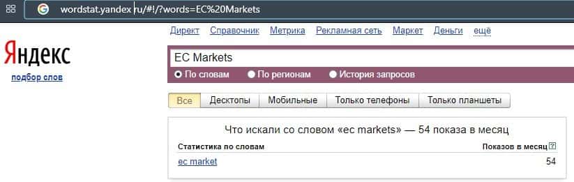 Запрос бренда "EC Markets" в базе Яндекс.Вордстат набрал 54 показа в месяц, поэтому можно смело считать, что в русскоязычном интернете они не очень популярны.