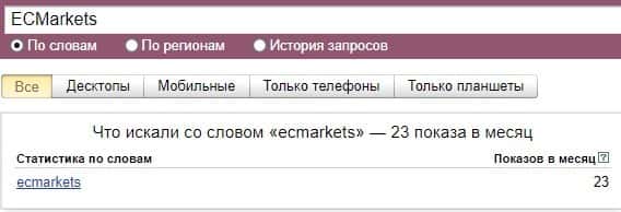 Бренд "ECMarkets" в поисковой системе Яндекс также не популярный, так как количество запросов по версии Яндекс.Вордстат равняются 23 за последний месяц.