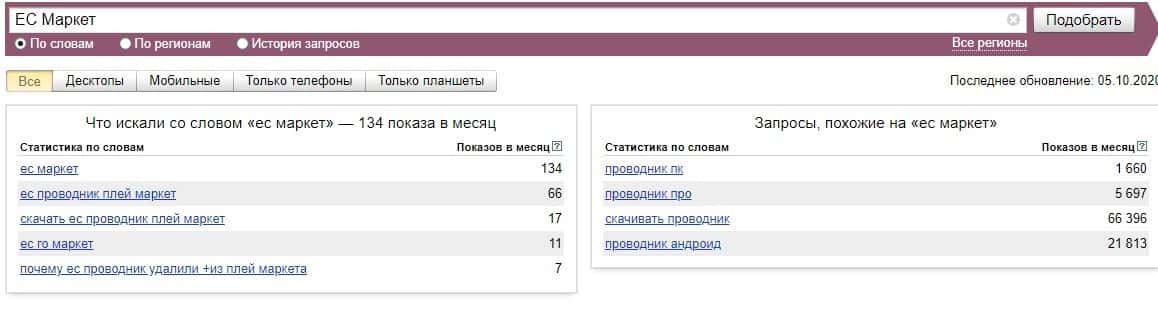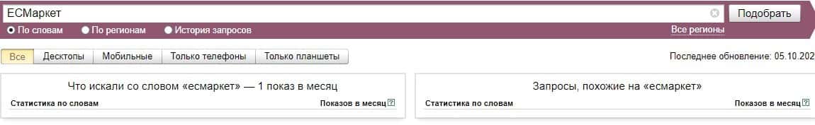 По поводу бренда "ЕСМаркет" сказать есть что, потому что Яндекс Вордстат за последний месяц насобирал всего-то 1 показ за месяц.
