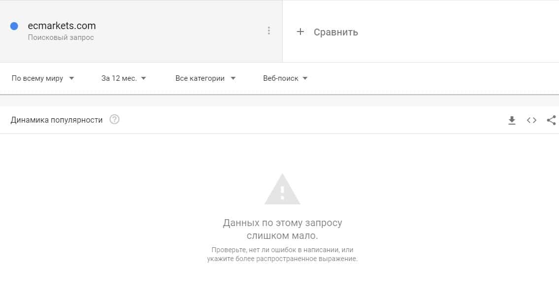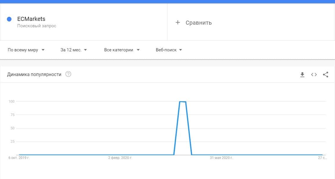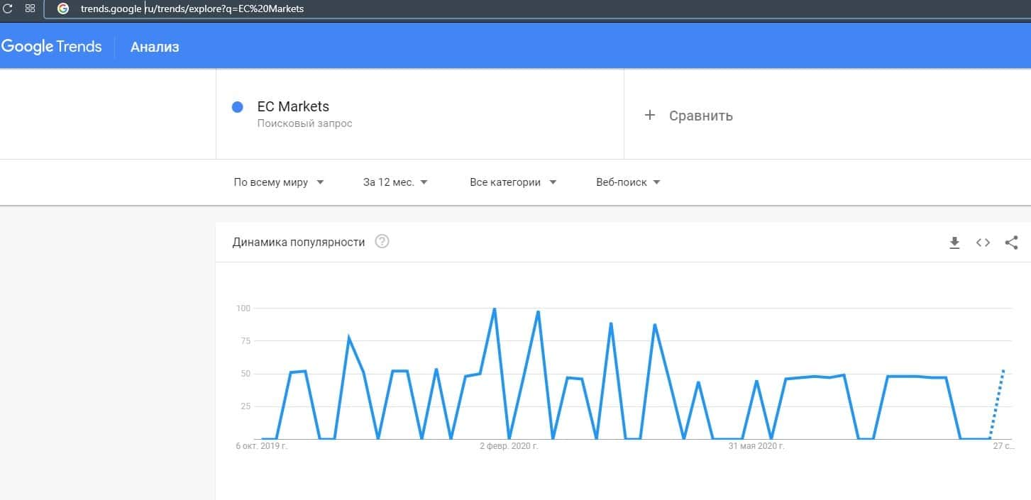 А вот бренду лохотрона "ECMarkets" также не повезло, потому что запрос по нему не был замечена практически никакая активность, так как они не популярны в Гугл.