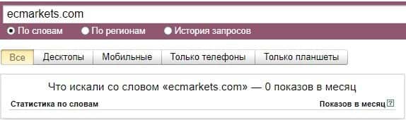 Согласно данным Яндекс.Вордстат, доменное имя "ecmarkets.com" на котором размещен сайт кухни EC Markets не было найдено ни одного запроса за последний месяц.