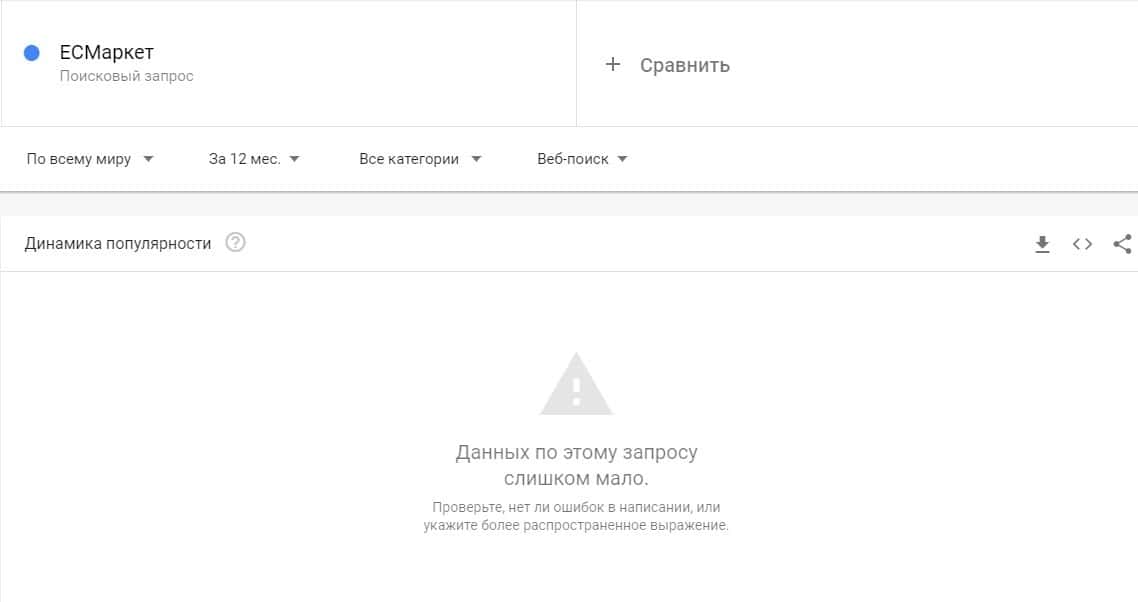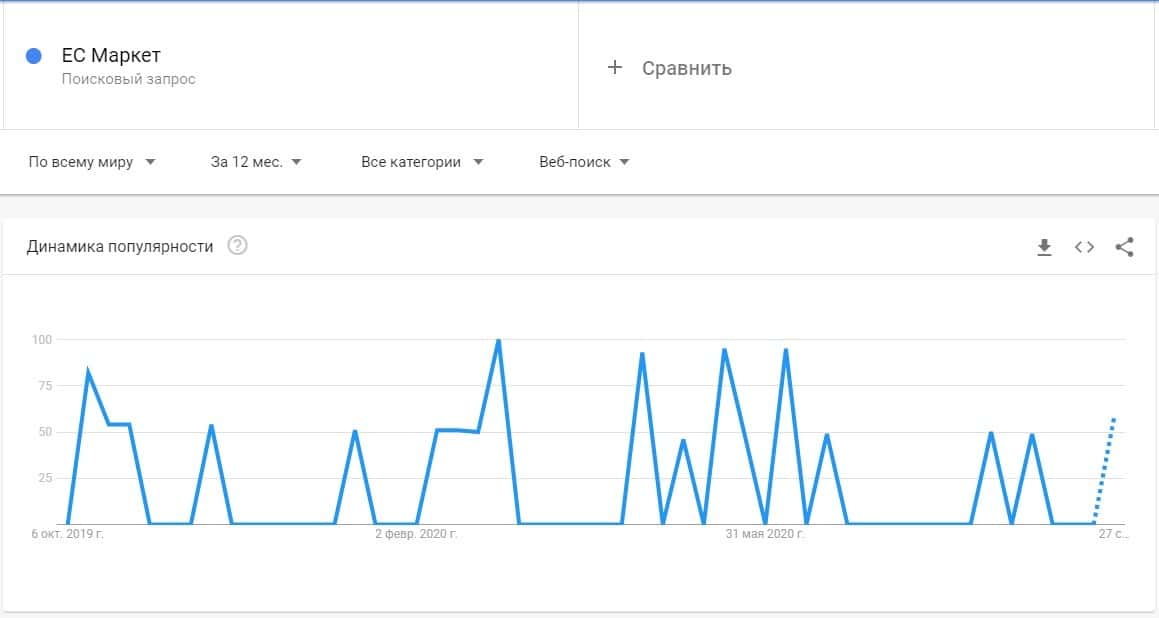 Касательно бренда "ЕС Маркет" есть небольшая активность в поисковой системе Гугл. Запросы в исходят непонятно откуда в импульсной среде.