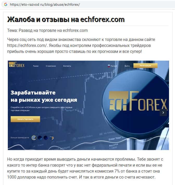 На интернет-портале это-развод ру замечена статья-отзыв об аферистах ЕЦХ Форекс. Представители данной скам-организации лгут людям о том, что предоставляют возможность торговать на международном финансовом рынке якобы под контролем профессиональных трейдеров, обещая невероятную прибыль.