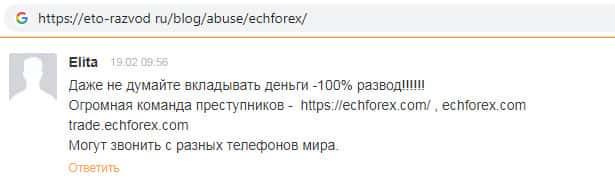 На веб-ресурсе forexareal ru обнаружен отзыв о жуликах ECHForex, автор которого некая Светлана пишет, что данный интернет-лохотрон вскоре может прекратить свое существование, либо же поменять название. Из этого следует вывод о том, что регистрироваться на сайте аферистов ЕЦХ Форекс ни в коем случае нельзя !!!