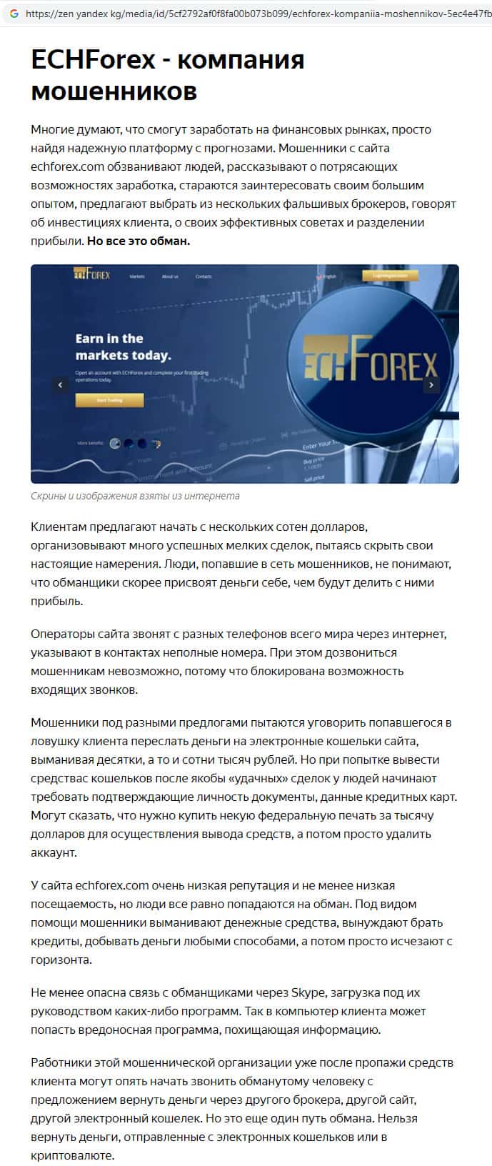 На информационном интернет-сервисе бинари-клаб ру отыскана статья о шулерах ЕЦХ Форекс, которые лишь имитируют брокерскую деятельность. В действительности никакой торговли здесь нет. Рекомендуем обходить стороной недобросовестную жульническую организацию ECHForex !!!
