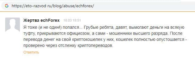 На сайте-отзовике eto-razvod ru отыскан комментарий о мошенниках ECHForex, автор которого пишет, что пытался торговать на их дырявом сайте криптовалютой, после чего окончательно разочаровался в данной конторе. Все потому, что при переводе денег через криптокошелек пользователь остается без средств.