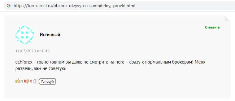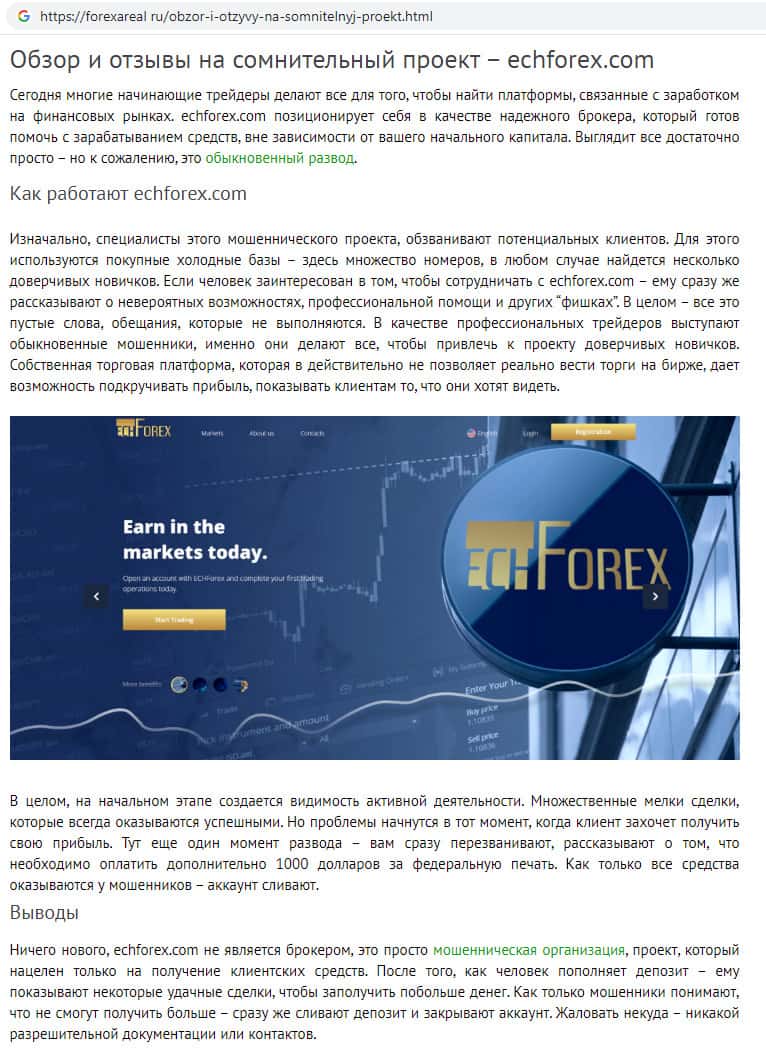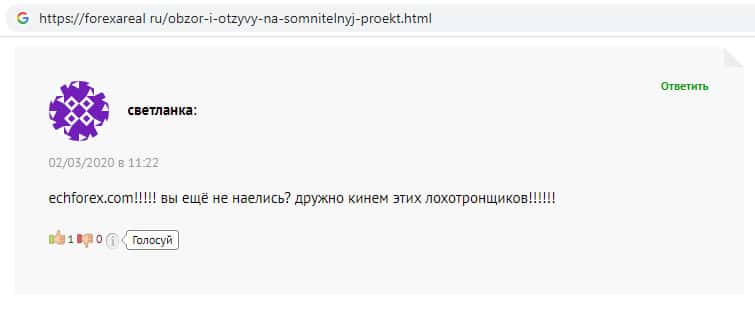 На интернет-портале форексареал ру замечен пользовательский отзыв об аферистах ЕЦХ Форекс, автор которого предпочел анонимность, поскольку так же пострадал от мошеннической деятельности данной псевдо-брокерской конторы. Автор комментария пишет, что никому не советует связываться со скам-брокером ECHForex.