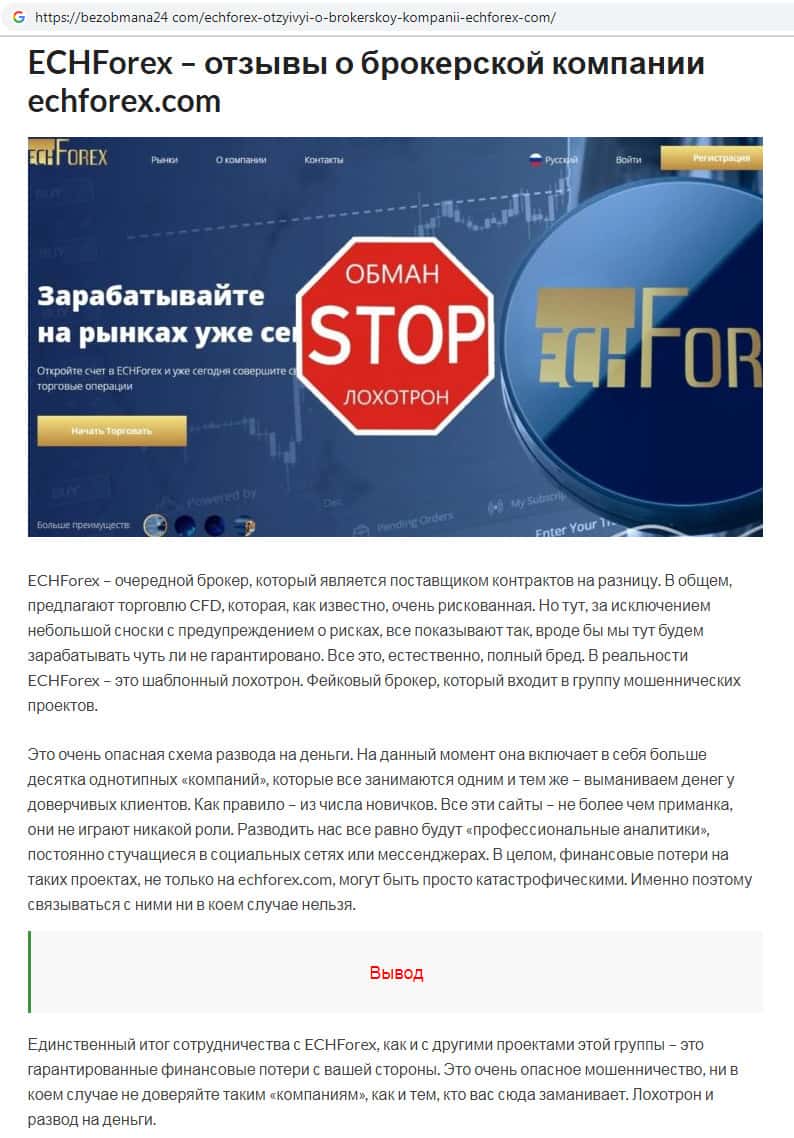 Фальшивый брокер ECHForex входит в группу мошеннических интернет-проектов