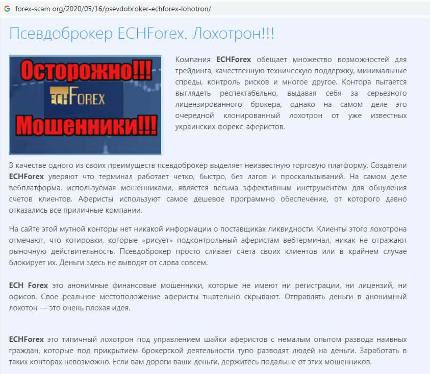 - Фальшивый брокер ECHForex входит в группу мошеннических интернет-проектов