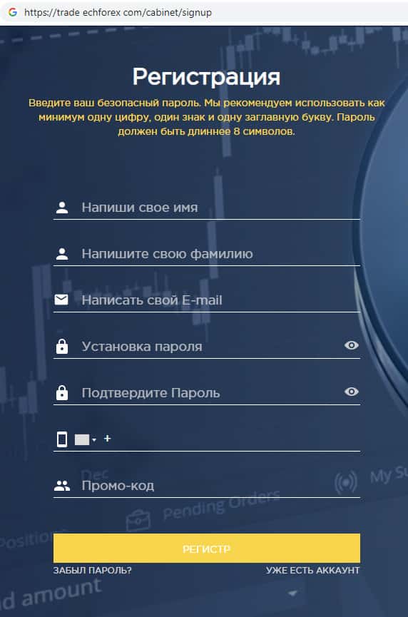 Для того, чтобы зарегистрироваться на сайте мошенников ECHForex необходимо назвать имя, фамилию, адрес электронной почты и пароль, его подтверждение и промо-код. Прежде чем принять такое решение зарегистрироваться на дырявом сайте шараги ЕЦХ Форекс, хорошо подумайте.