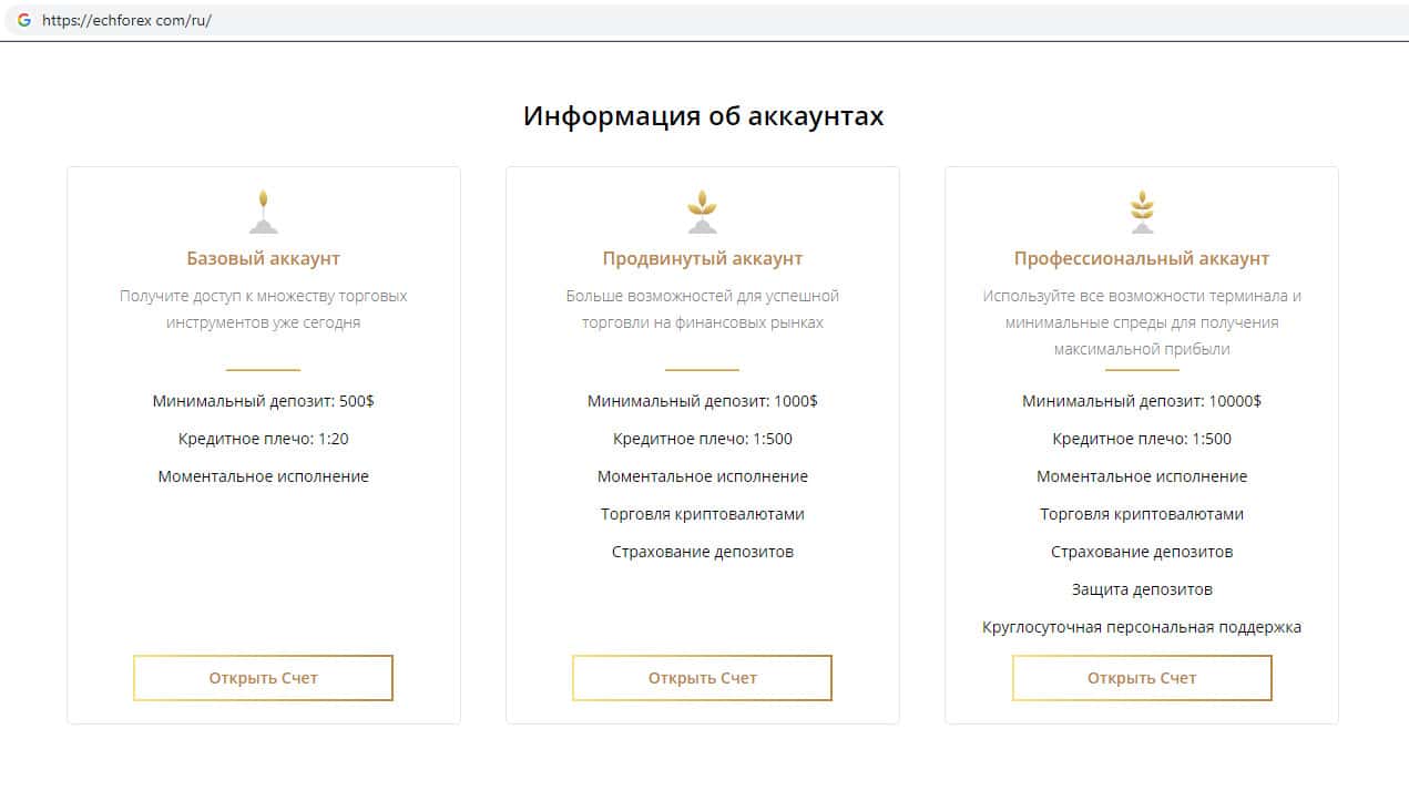 Типы торговых аккаунтов предоставленных на веб-сервисе шулеров ECHForex