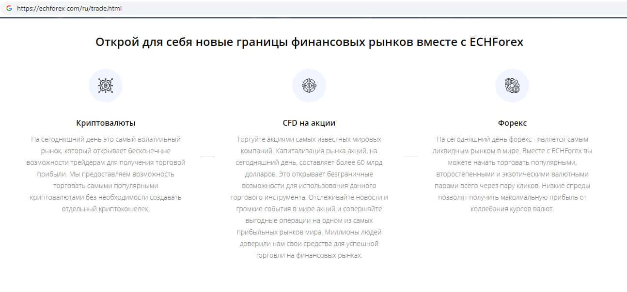 Здесь жулики ЕЦХ Форекс пишут о том, что их компания якобы предлагает торговать критовалютами, что само по себе не выгодное дело, поскольку курс криптовалют не стабилен. В таком случае можно утверждать о том, что аферисты ECHForex предлагая такой вариант торговли на их сайте, наживаются на людях.