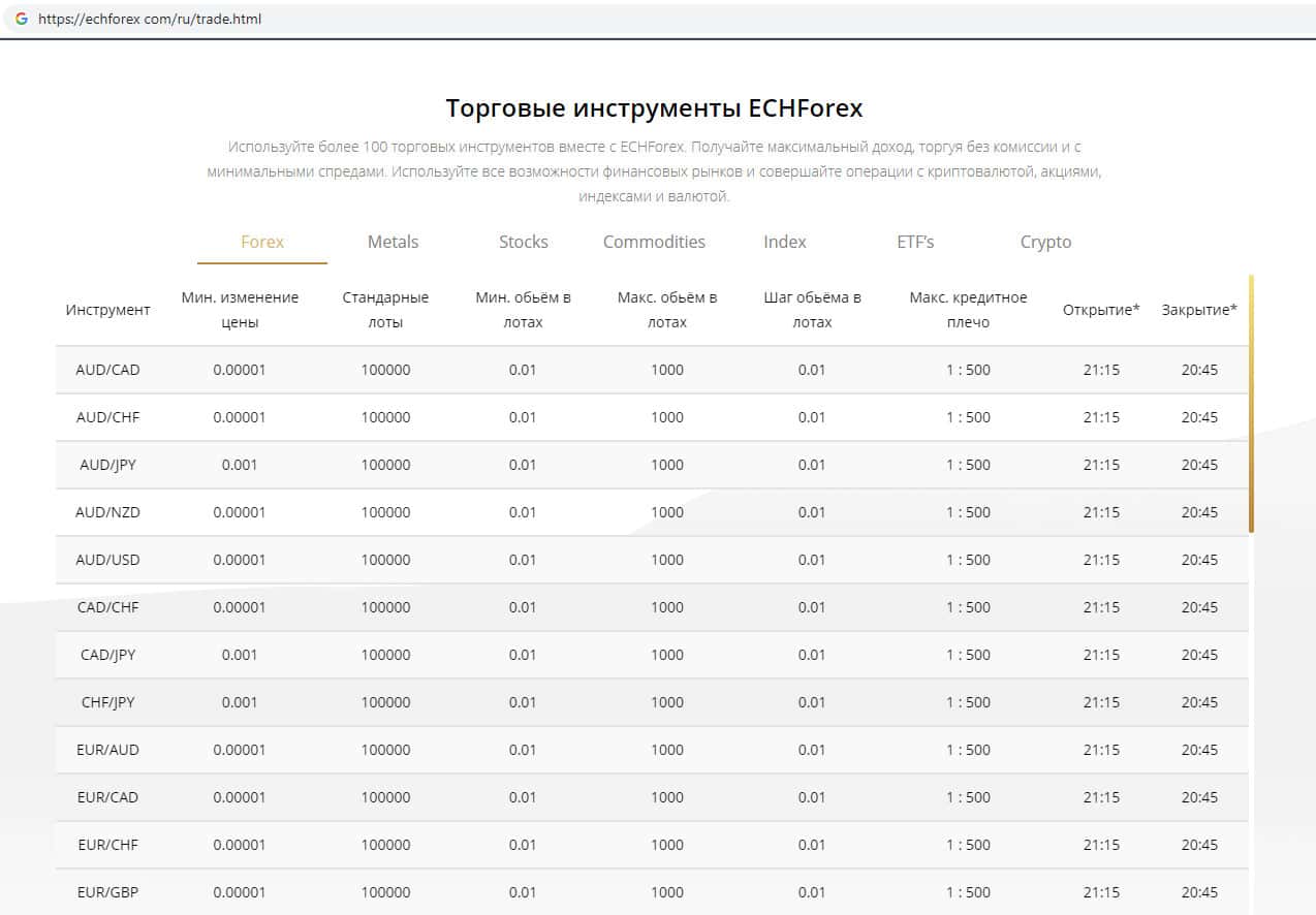 Псевдо-брокерская организация ECHForex как и прочие скам-компании, вешает лапшу на уши о том, какое разнообразие торговых инструментов на их сайте. На самом деле вся информация о том, что разнообразие инструментов каким-либо образом повлияет на доходность – легенда, и не более того !!!