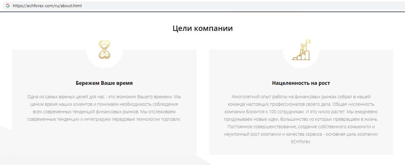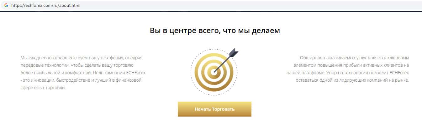 Здесь аферисты ЕЦХ Форекс для того, чтобы создать иллюзию надежности и важности своей компании пишут о том, что их главной целью является предоставление качественных услуг, что на самом деле далеко не так. Главной целью шараги ECHForex является обворовывание клиентов и набивание своих кошельков их деньгами.