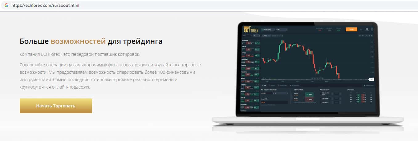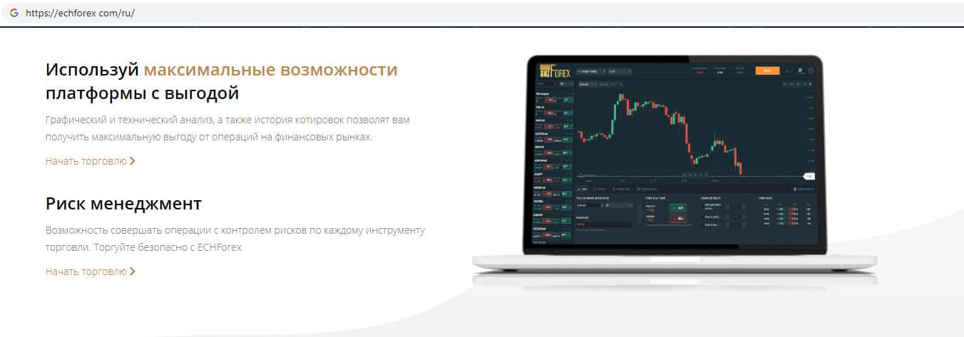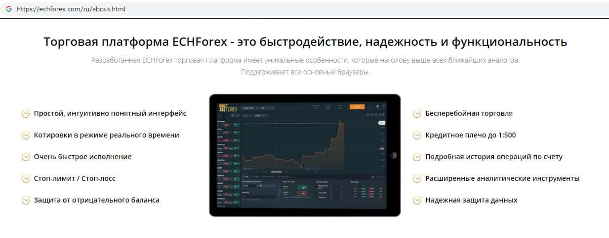 Мошенники ECHForex расхваливают свой сайт как можно больше предлагая пользователям начать торговать на их сайте. Здесь жулики вешают людям лапшу на уши, что их торговая платформа понятная и удобная, что она разработана как для компьютеров так и для мобильных устройств. Это шулера ЕЦХ Форекс называют удобством пользования платформой.