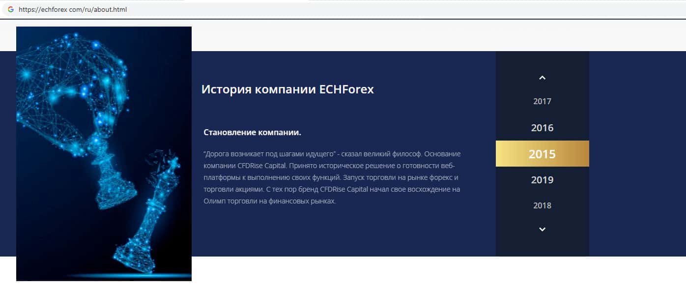 Жулики ЕЦХ Форекс предоставляют возможность пользователям сайта ознакомиться с историей создания их организации. Подобные конторы зачастую используют данную ловушку рассказывая о том какие достижения были, и конечно же о том какой красивый у них офис. Верить аферистам ECHForex нельзя, а вкладывать свои деньги на их сайте тем более !!!