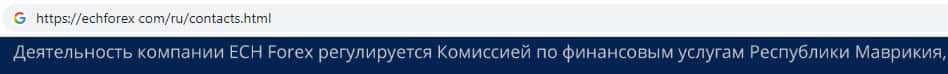 Жульническая организация ECHForex имеет оффшорное место регистрации, а именно зарегистрирована в Республике Маврикий, что является показателем того, что компания не подходит для граждан РФ. В случае утраты Вами денежных средств Вы ничего не докажете и не сможете вернуть деньги !!!