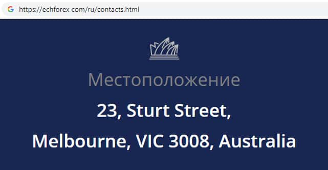 Согласно контактной информации, которую указывает о себе, главный офис мошеннической организации ECHForex находится в Австралии. Где ныне базируется огромное количество аналогичных компаний.